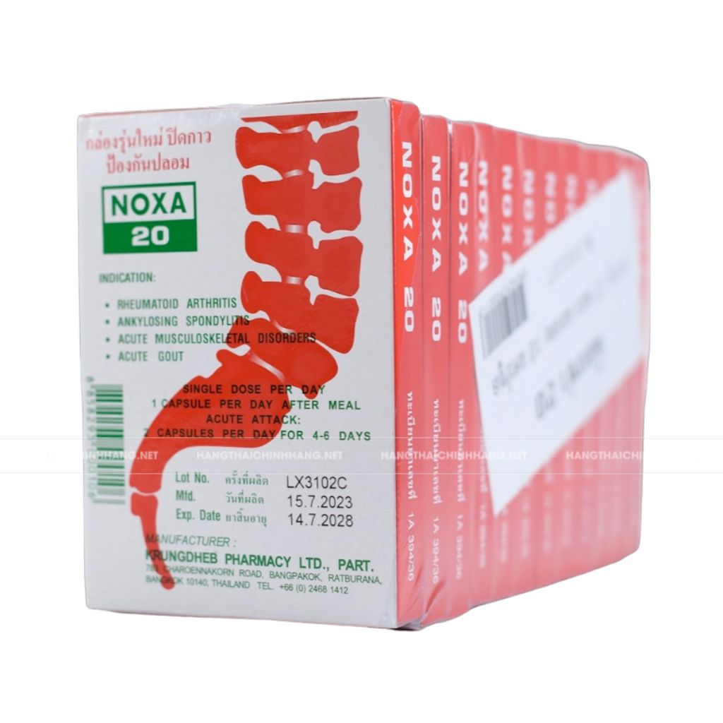 Noxa 20 Thái Lan là thuốc trị viêm khớp có tác dụng chống viêm và giảm đau. Thuốc được sử dụng để điều trị các bệnh lý xương khớp, bao gồm:
