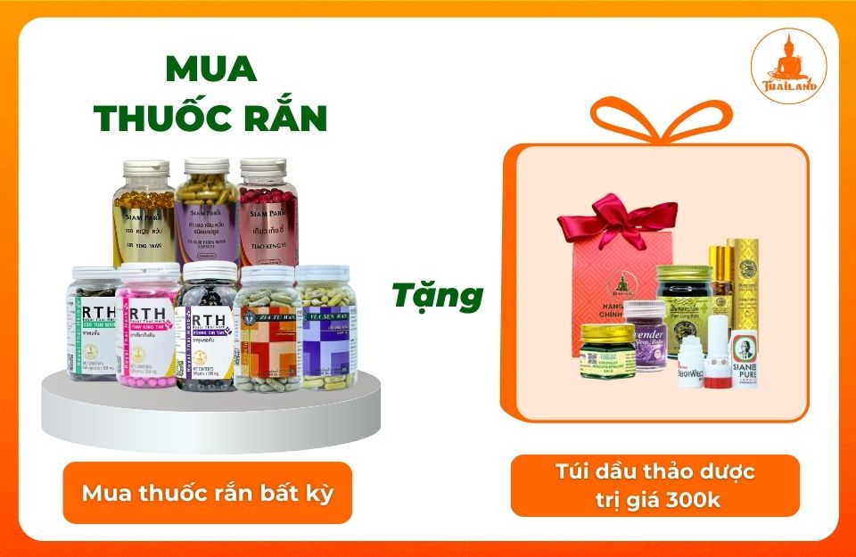 - Mua bất kỳ sản phẩm thuốc rắn nào, nhận ngay túi dầu thảo dược trị giá 300.000 VNĐ.