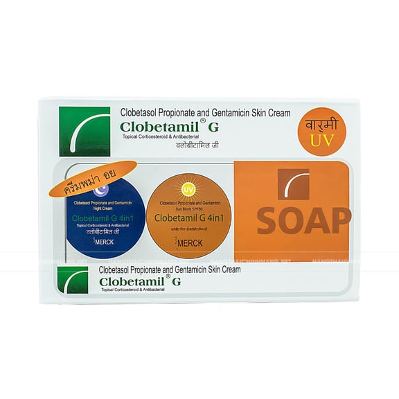 Bộ kem Clobetamil G 4 in 1 Thái Lan là giải pháp hỗ trợlàm sáng da và mờ nám, tàn nhang, giúp bạn tự tin với làn da khỏe đẹp mỗi ngày. Sản phẩm bao gồm 4 món: xà phòng cam nghệ Galong, kem dưỡng da và chống nắng ban ngày SPF 50, tuýp kem nám Clobetamil G, kem dưỡng trắng và làm mờ thâm ban đêm. Các thành phần trong bộ sản phẩm đã được Bộ Y tế Thái Lan chứng nhận an toàn và hiệu quả nên bạn hoàn toàn có thể an tâm khi sử dụng.