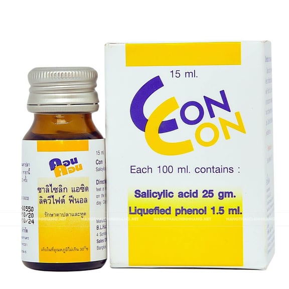 Chi tiết thành phần: Each 100ml, Salicylic Acid 25gm, Liquefied Phenol 1.5ml. Trong đó, Salicylic Acid và Liquefied Phenol là hai thành phần chính trong thuốc trị mụn cóc con con.