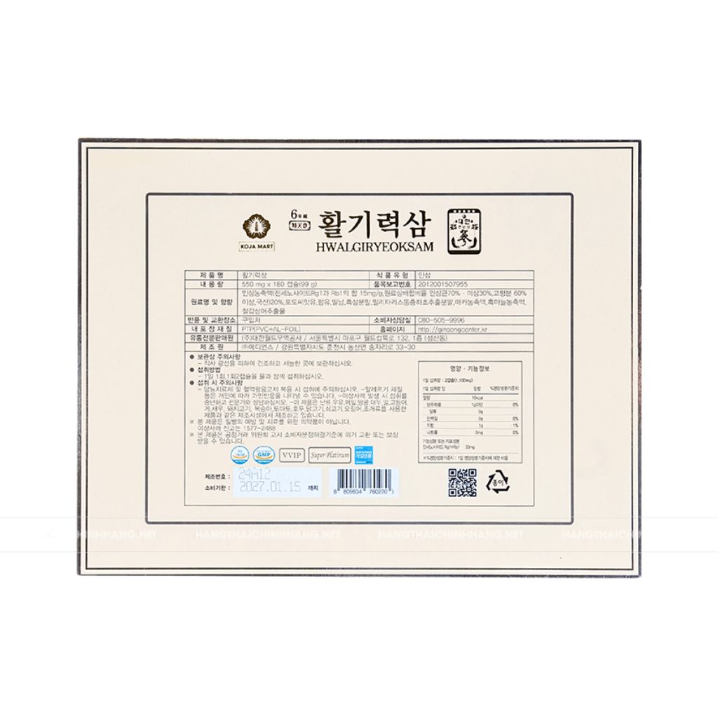 - Tinh chiết nhân sâm Hàn Quốc cô đặc: 220mg (tương ứng 3,3 mg Ginsenosides Rg1 + Rb1).